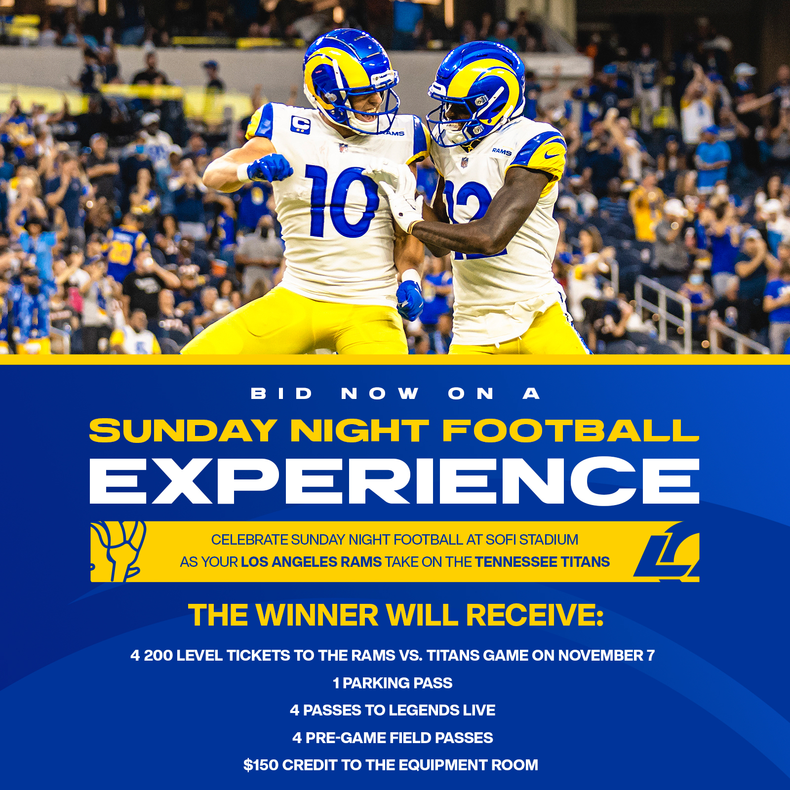 Rams Community On Twitter Celebrate And Watch Sunday Night Football At Sofistadium Bid On An Experience Package To See The Ramsnfl Vs The Titans Including 4 200 Level Tickets 4 Passes To